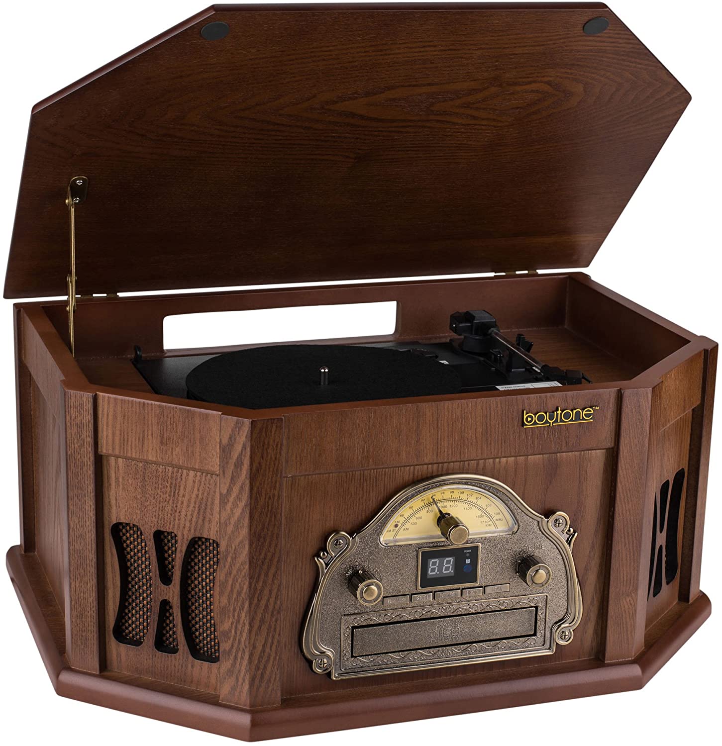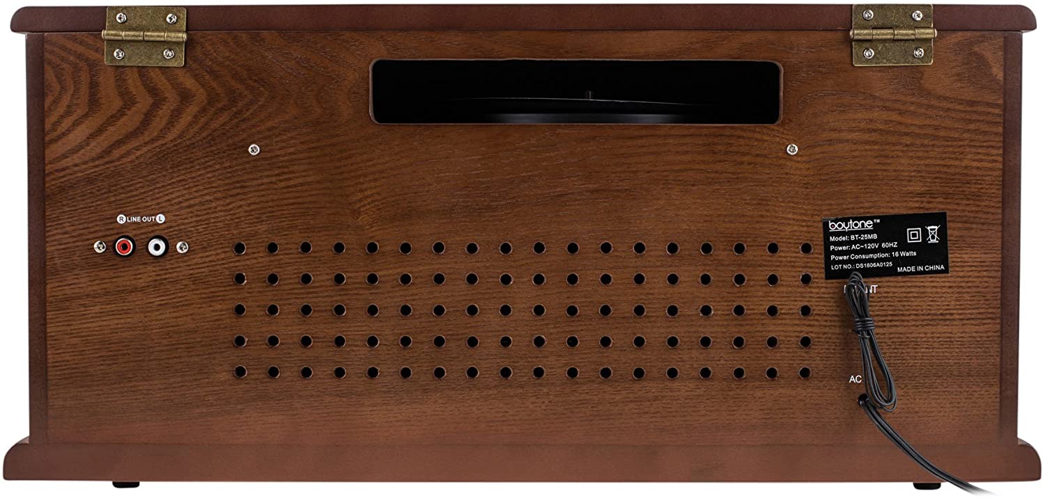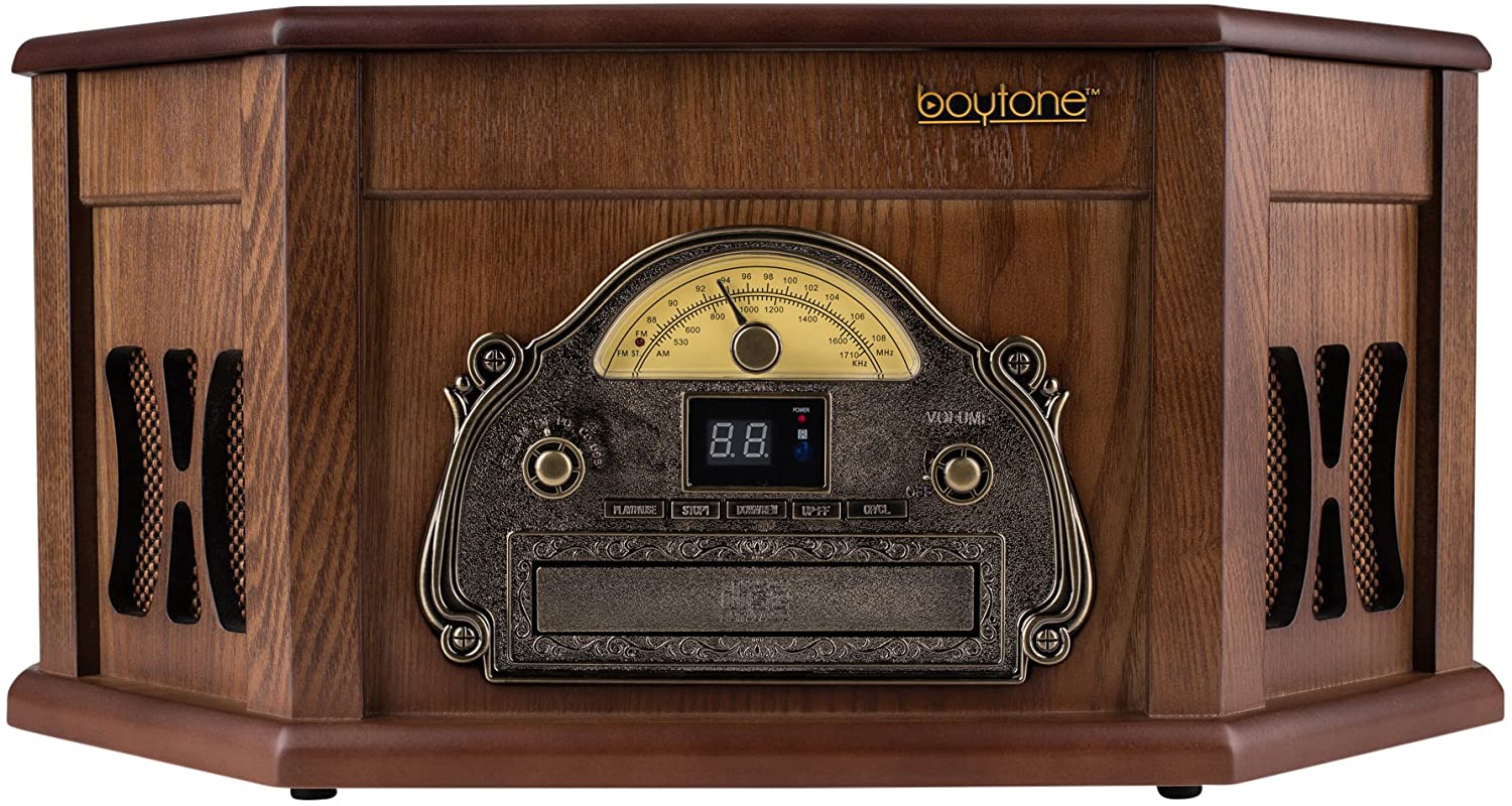 Boytone BT-25MB 8-in-1 Natural Wood Classic Turntable Stereo System with Bluetooth Connection, Vinyl Record Player, AM/FM, CD, Cassette