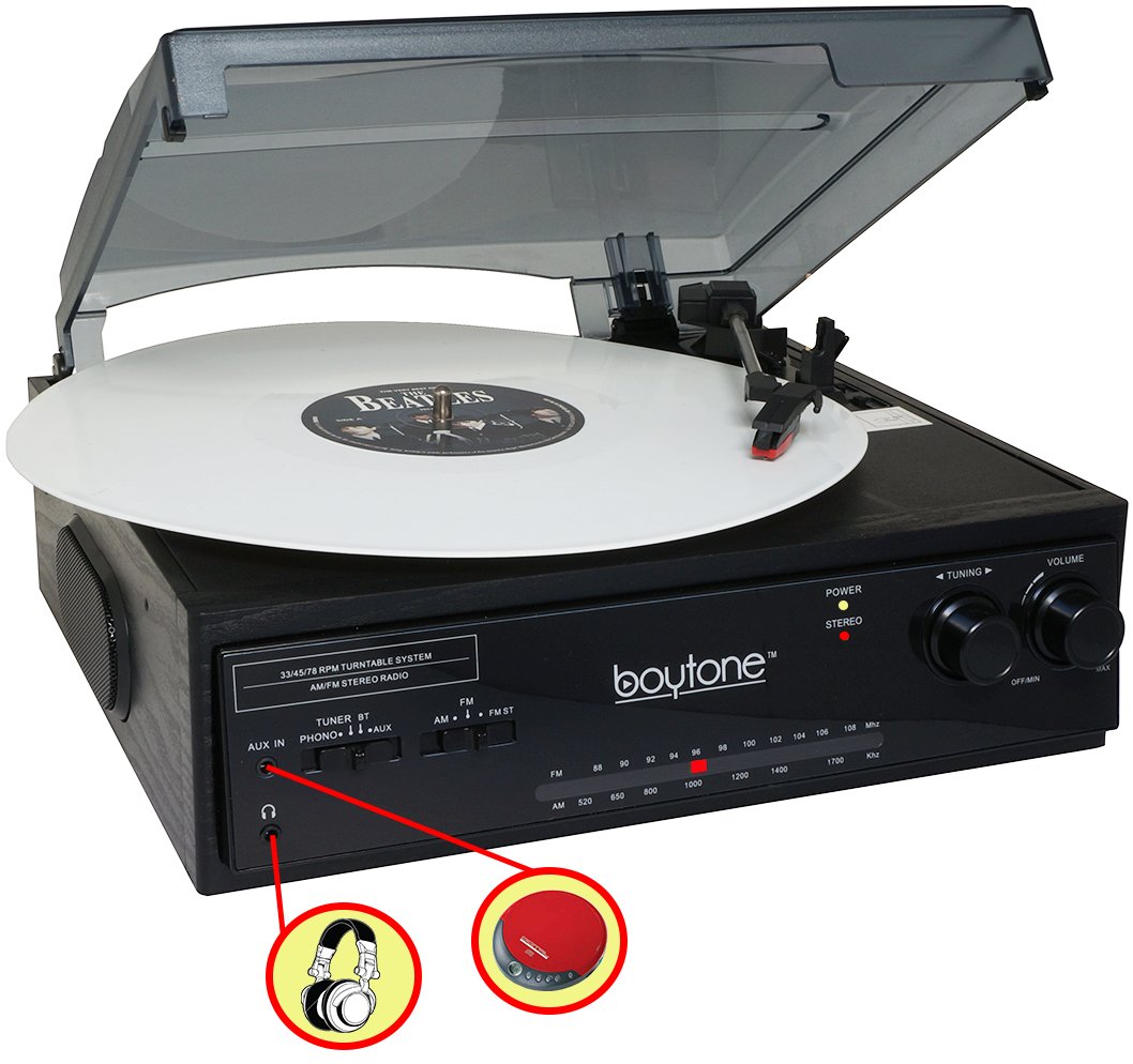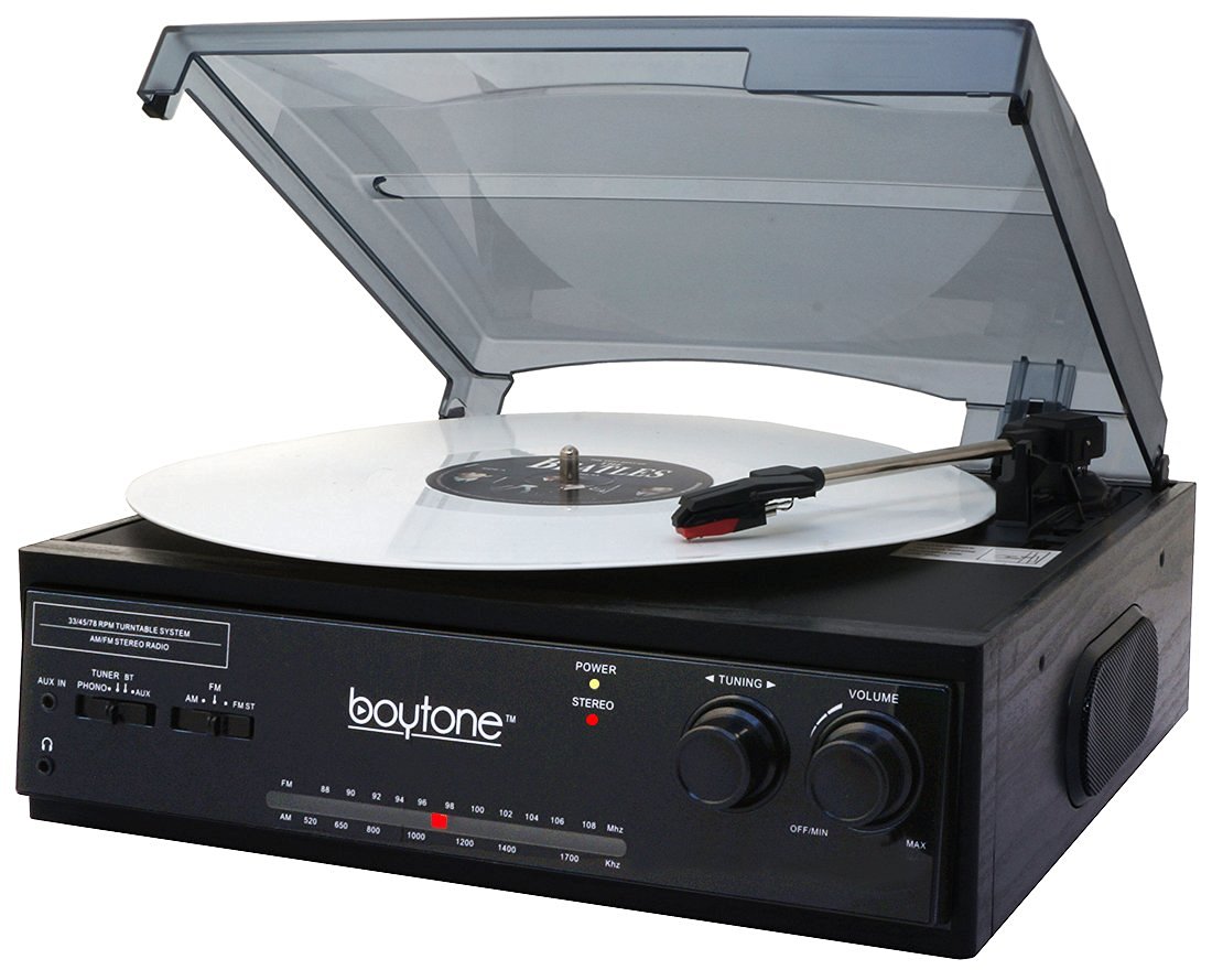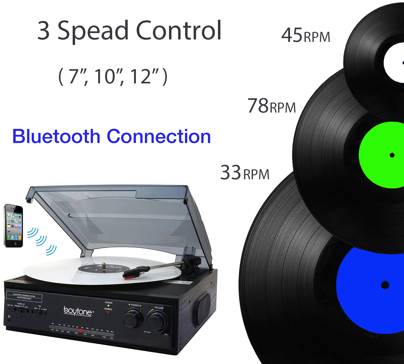 Boytone BT-13B with Bluetooth Connection 3-Speed Stereo Turntable Belt Drive 33/45/78 RPM, 2 built in Speakers AM/FM Stereo Radio, 3.5mm Headphone Jack/ Axillary, RCA Jack, 45 Rpm Adapter Included