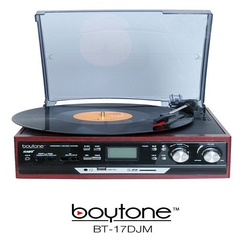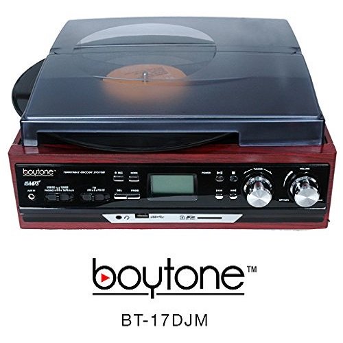 Boytone BT-17DJM-C record player turntable with modern technology. This player does it all 3-speed vinyl, digital MP3 playback with USB and SD cards, AM/FM radio, digital display with frequency (FM 88 - 108 MHz, AM 540 - 1600 kHz), wireless remote control, 2 built-in speakers, Rotary Knobs and even a cassette player. This system has the ability to turn your favorite record, boytone BT-17DJM-C it's a 33, 45, and 78 RPM record, into MP3s via the USB or SD ports Convert vinyl to MP3 format without a computer.BT-17DJM-C will handle media from almost every generation. Plus, you can even convert your old vinyl and cassettes to digital MP3 files using this player. And with a 3.5mm auxiliary input jack, you can also connect your iPod, iPhone, iPad, Android cell phone, or virtually any other digital music player with a headphone jack. The BT-17DJM-C includes LCD display, and bass-boost technology for rich, booming bass. For the ultimate combination of old and new, boytone BT-17DJM-C Cherry wood color finish. Dimensions: 15"(W) x 14"(D) x 8"(H)