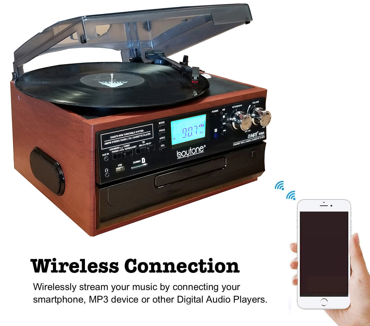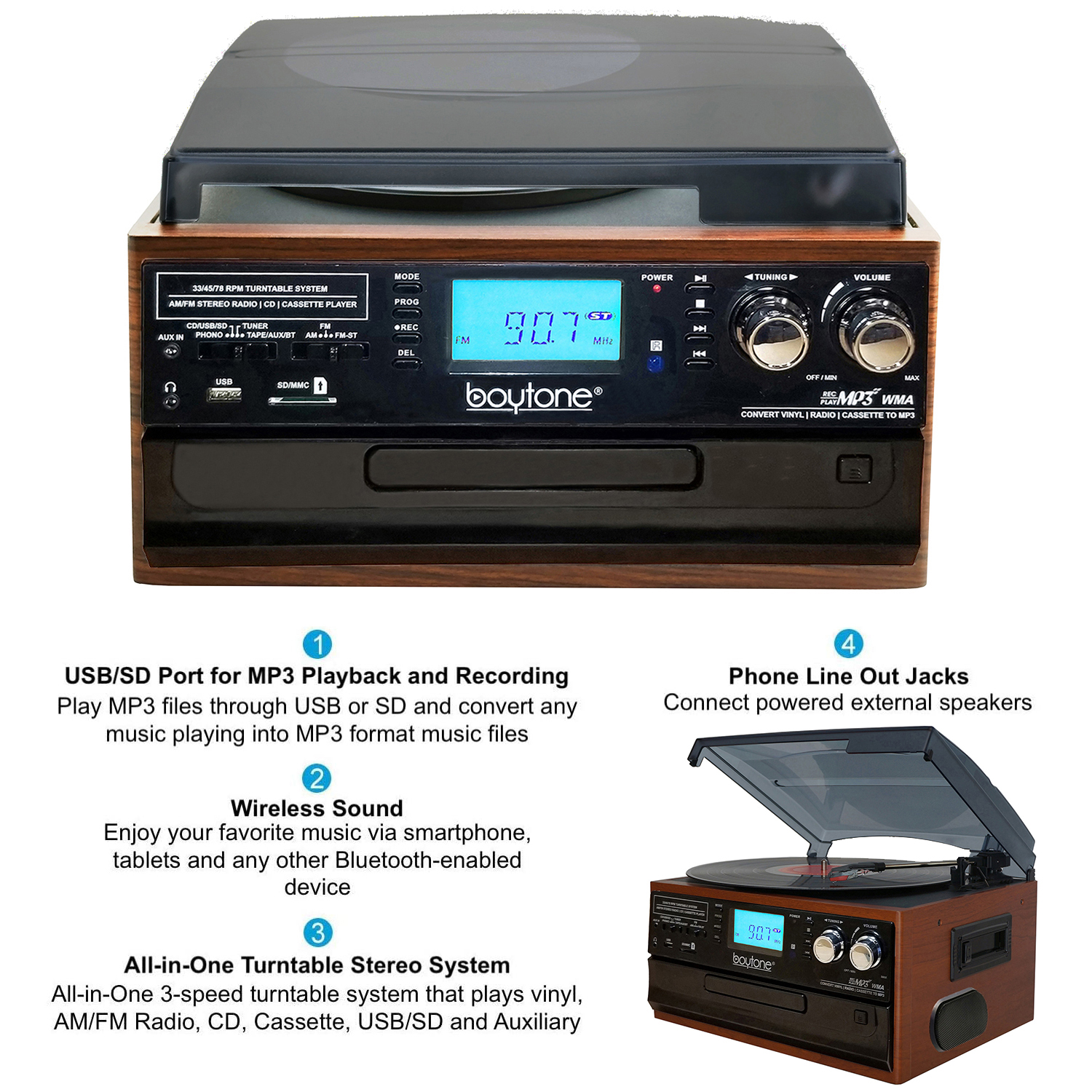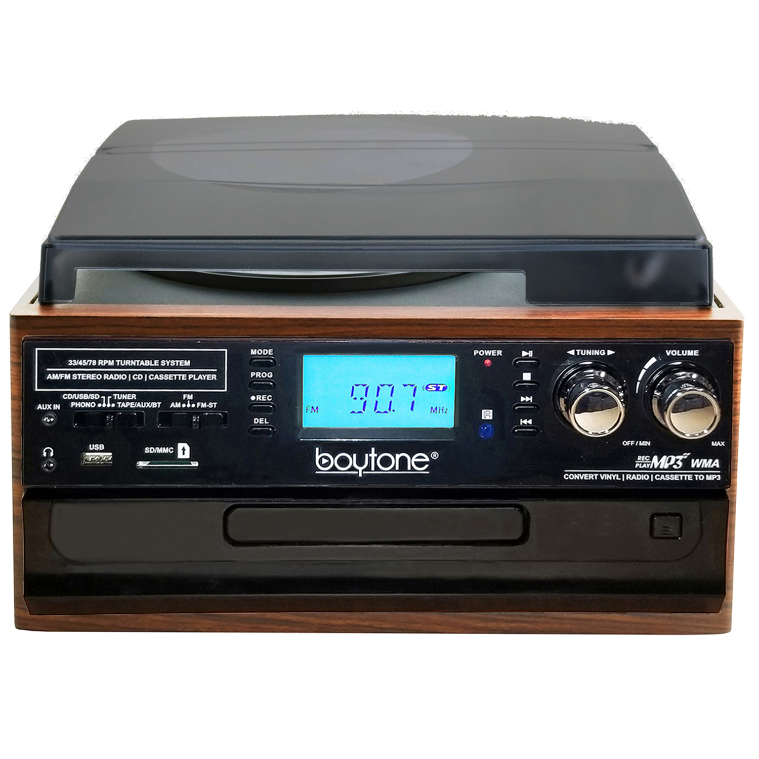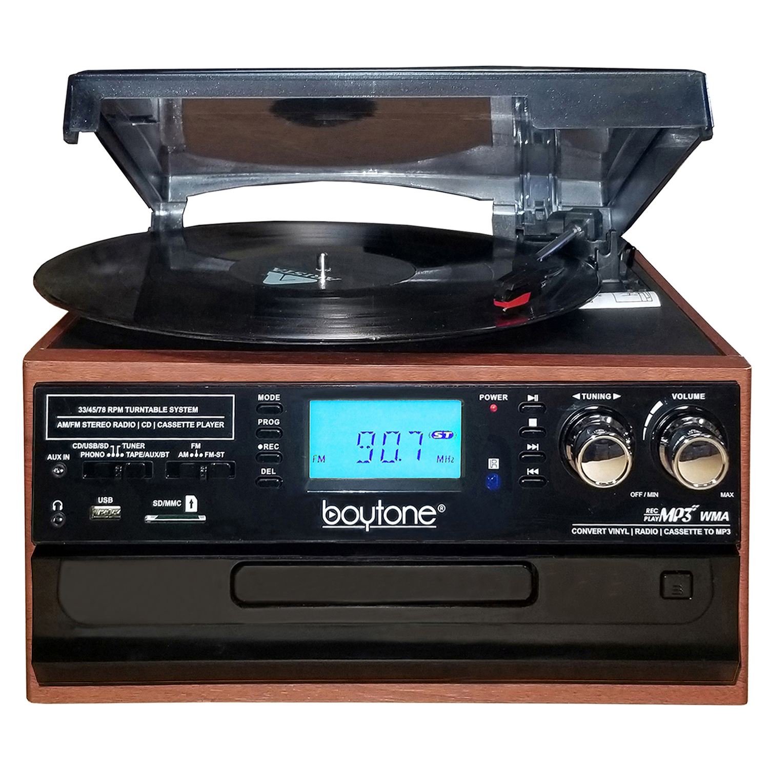 Boytone BT-22MS, Bluetooth Record Player Turntable, AM/FM Radio, Cassette, CD Player, 2 Built in Speaker, Ability to Convert Vinyl, Radio, Cassette, CD to MP3 Without a Computer, SD Slot, USB, AUX