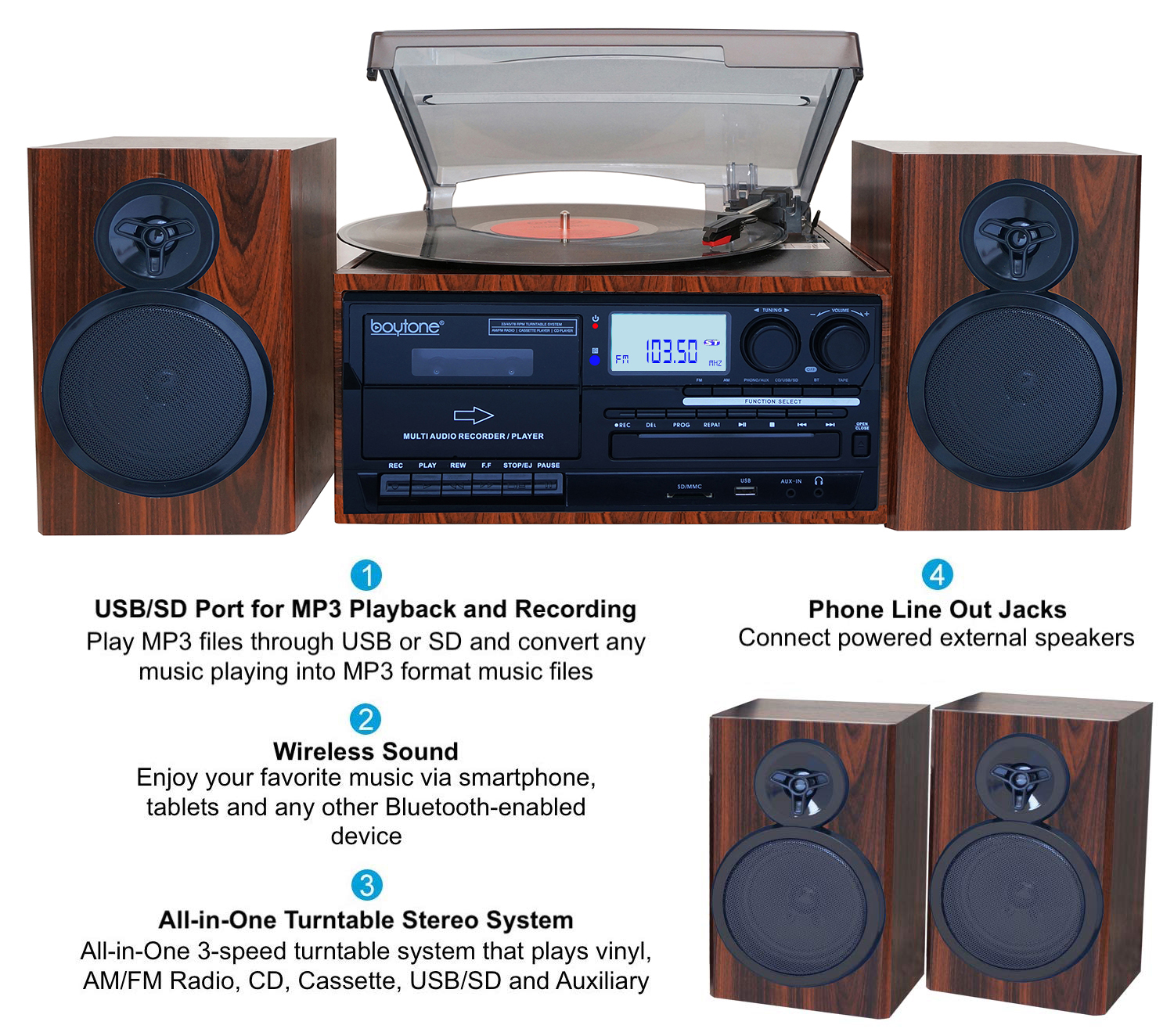 Boytone BT-28MB, Bluetooth Classic Style Record Player Turntable with AM/FM Radio, CD / Cassette Player, 2 Separate Stereo Speakers, Record from Vinyl, Radio, and Cassette to MP3, SD Slot, USB, AUX