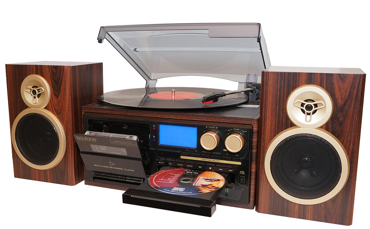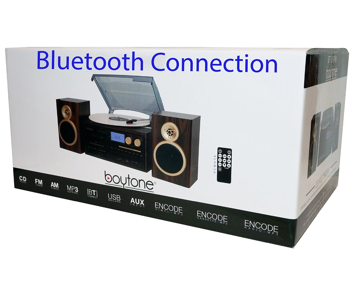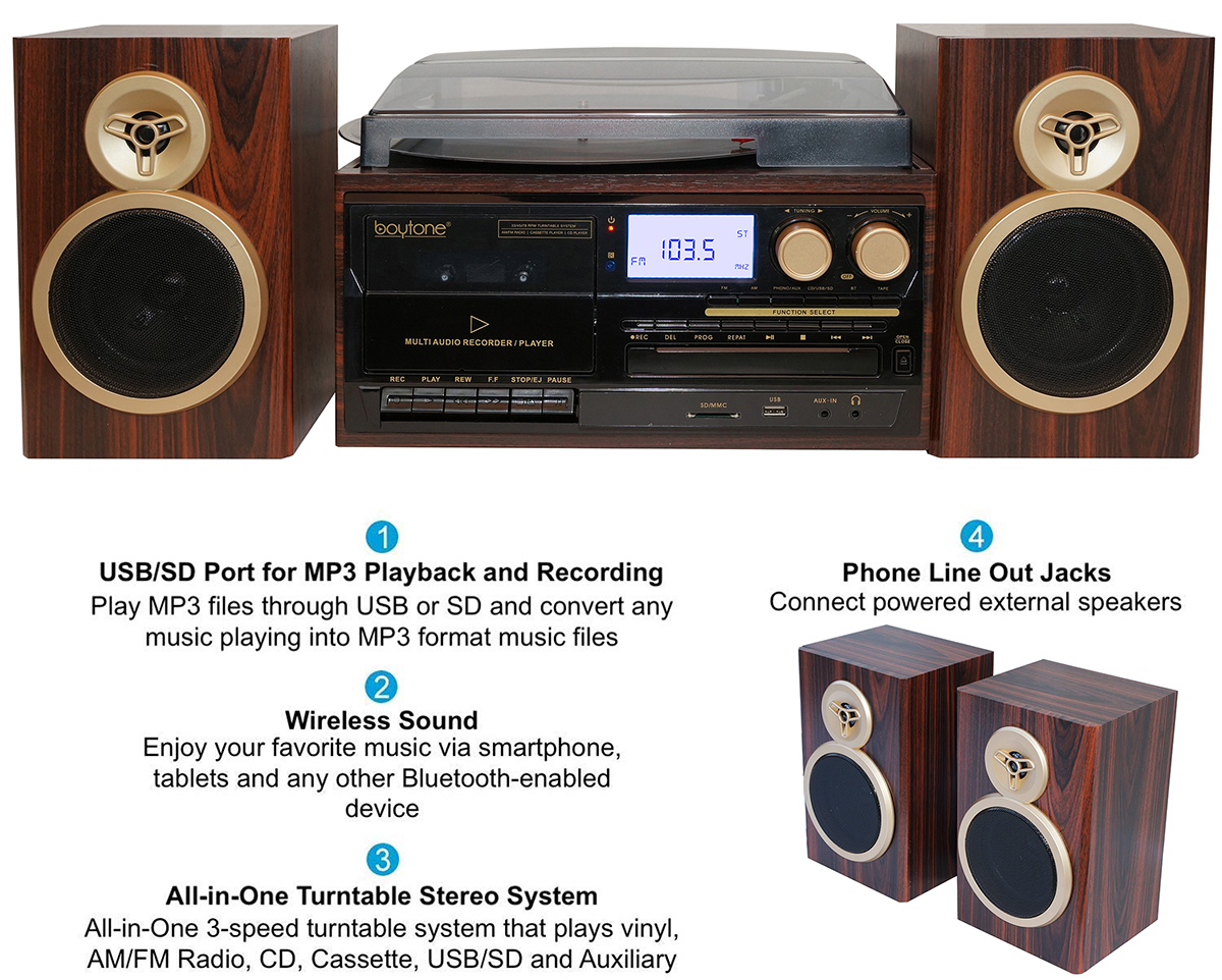 Boytone BT-28SPM, Bluetooth Classic Style Record Player Turntable with AM/FM Radio, CD / Cassette Player, 2 Separate Stereo Speakers, Record from Vinyl, Radio, and Cassette to MP3, SD slot, USB, AUX.