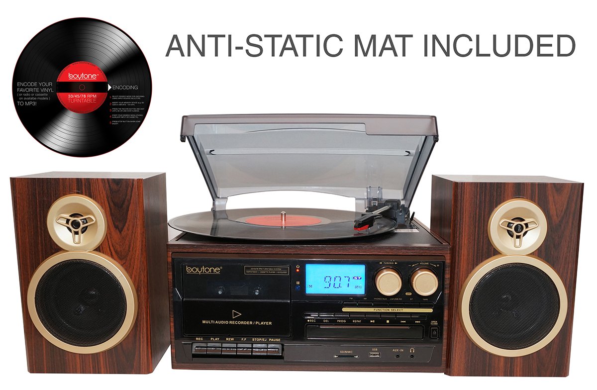 Boytone BT-28SPM, Bluetooth Classic Style Record Player Turntable with AM/FM Radio, CD / Cassette Player, 2 Separate Stereo Speakers, Record from Vinyl, Radio, and Cassette to MP3, SD slot, USB, AUX.