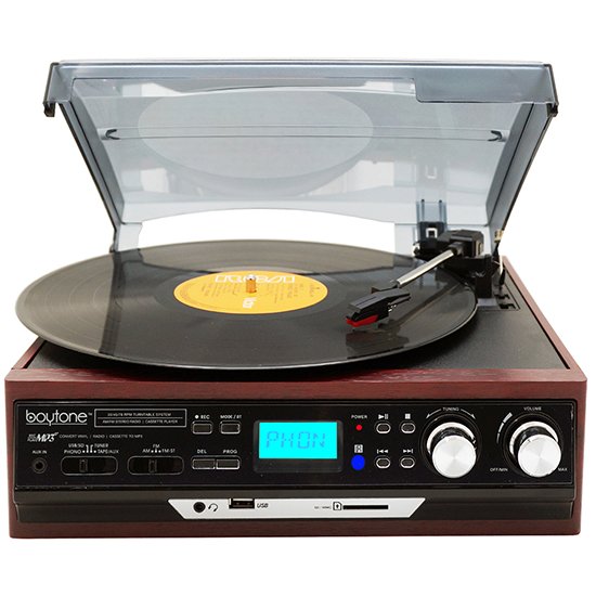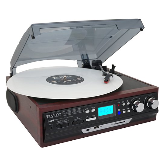 Boytone BT-37M-C, Connect Wirelessly to Bluetooth Speaker Devices 3-speed Stereo Turntable, 2 Built in Speakers Digital LCD AM/FM, USB/SD/AUX+ Cassette/MP3 & WMA Playback /Recorder/ Headphone Jack