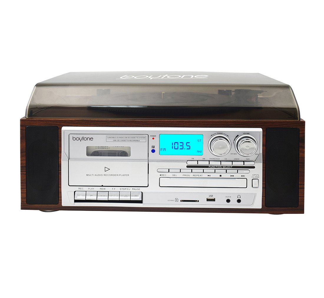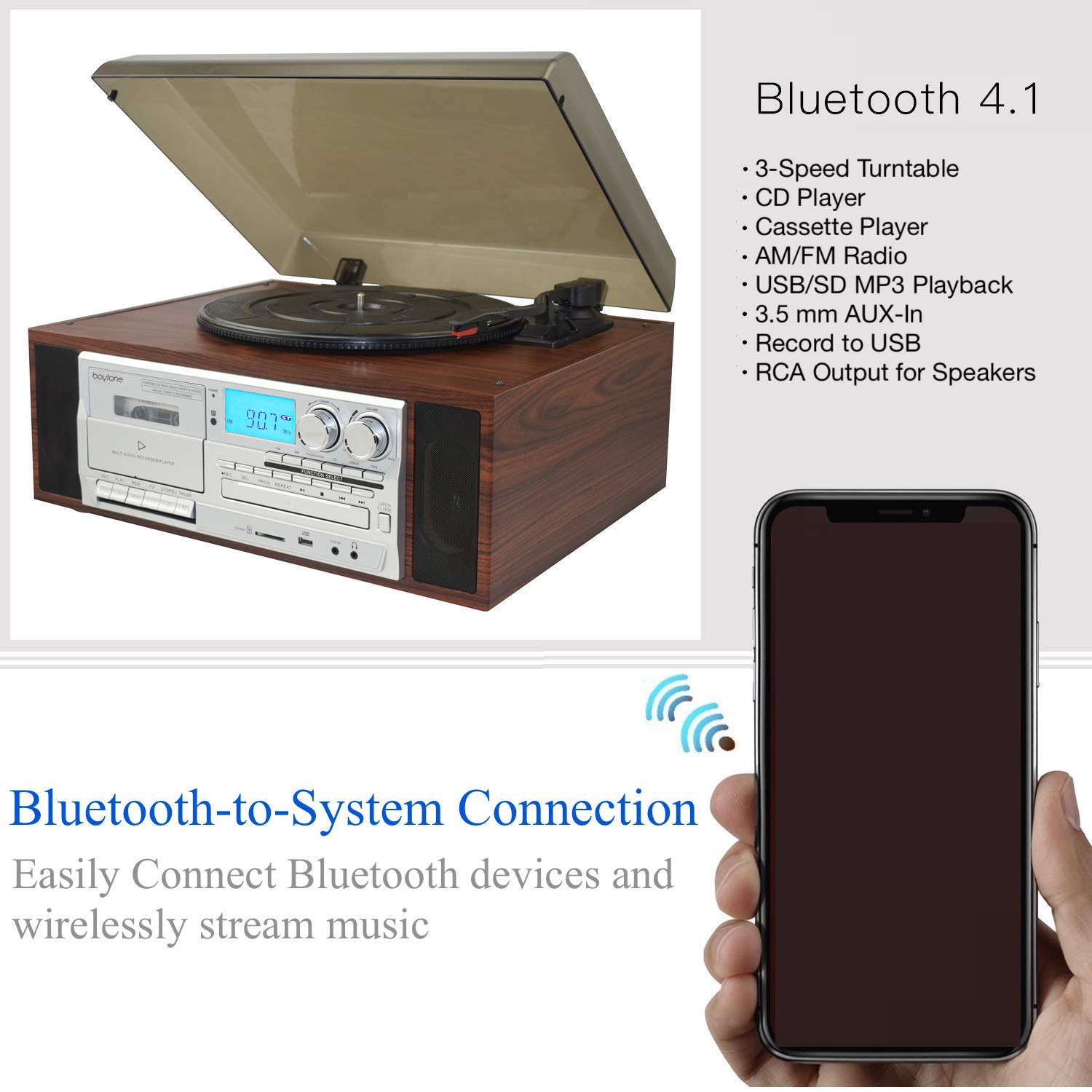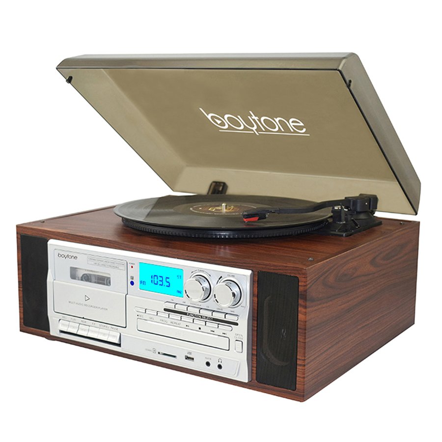 Boytone BT-38SM, Bluetooth Classic Style Record Player Turntable with AM/FM Radio, CD / Cassette Player, 2 Built-in Stereo Speakers, Record from Vinyl, Radio, and Cassette to MP3, SD slot, USB, AUX.
