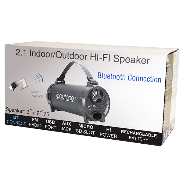 Boytone BT-40BK Portable Bluetooth Indoor/Outdoor Speaker 2.1 Hi-Fi Cylinder Loud Speaker with Built-in 2x3 Sub and SD Card, USB, USB Charger, AUX, FM Radio, Built in Rechargeable Battery