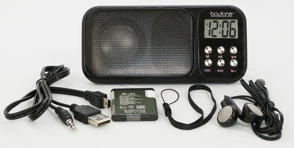 Boytone BT-92B Portable FM Transistor Clock Radio Alarm, Countdown timer, Built-in Speaker, Rechargeable Batteries, Headphone Jack, LCD Tuning & Carry Strap + USB, Micro SD slot, AUX, LED Flash Light